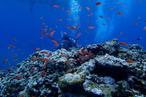 サンゴの上のデバスズメダイ、浅い根のキンギョハナダイ&アカネハナゴイは抜群ですね。