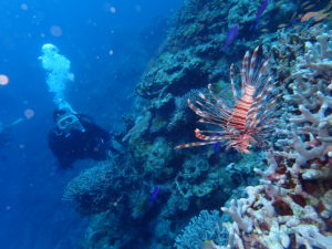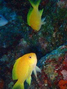 亀裂にはネムリブカ、サンゴの上をハナミノカサゴ、キンギョハナダイ、ハナゴイは鮮やか♪