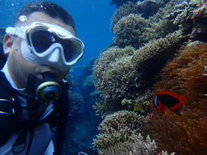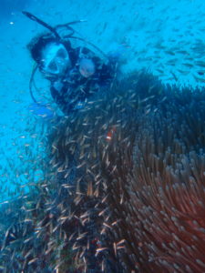 少し深場にいるスミレナガハナダイ、ヤイトヤッコの雄雌、そして大きなシャコガイ、色々なクマノミ