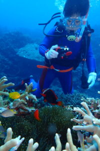 クマノミ、大きなシャコガイ、ユビエダサンゴから出たり入ったりスズメダイ😆