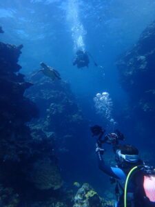 アオウミガメが現れ一緒に泳げたり、ホワイトチップもいましたね。