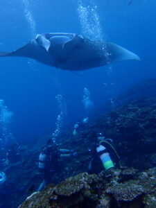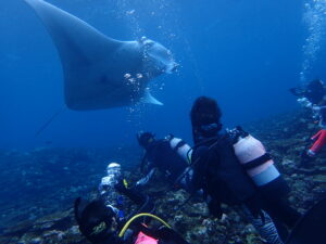 泡を好むマンタさんで泡に当たりに来るように私達の上を行ったり来たり