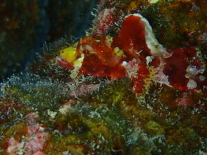 ヒレボシミノカサゴ幼魚は岩の海綿に擬態していて
