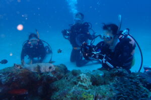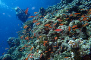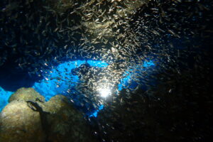 溢れるテンジクダイ、カノコイセエビ、光のシャワー