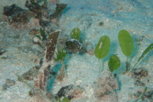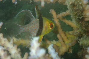 ↓葉っぱの横、モンヨウフグ幼魚、小さなエビもいました。