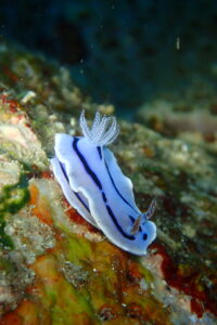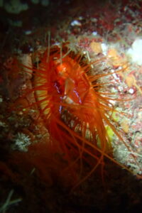 ハナミノカサゴ幼魚、ミゾレウミウシ、ゴシキエビが白いひげを伸ばし