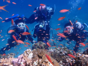 サンゴ畑、鮮やかなキンギョハナダイ、ハマクマノミ