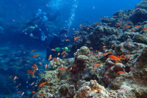 キンギョハナダイ、サンゴ畑、色々なクマノミ