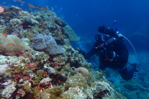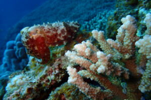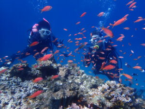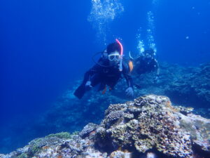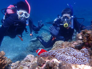 ハナミノカサゴを見つけてくれたり、沖縄らしいきれいな色の魚に広がるサンゴ